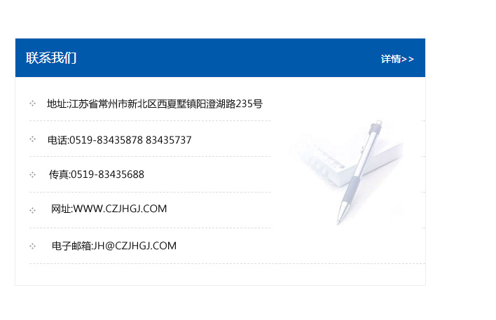 傳真:0519-83435688    郵編:213135    網址:WWW.czjhgj_com.ttp-rae.com    電子郵箱:JH@czjhgj_com.ttp-rae.com